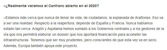 Après la référence au projet d'aménagement de la plate-forme de Los Arañones, porté par la DGA, José Luis Soro rappelle les efforts des 2 exécutifs régionaux. Et la responsabilité des 2 gouvernements. Avant de se féliciter de l'appui de l'Europe. Résolument optimiste, sans être pour autant déconnecté du réel.