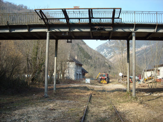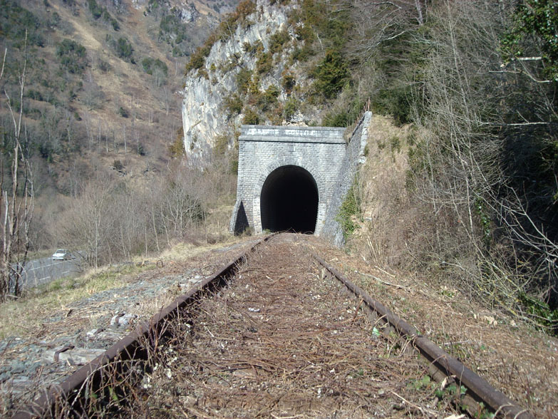 Le passage de la route au sud la gare de Sarrance, le village et le gave sont à gauche.