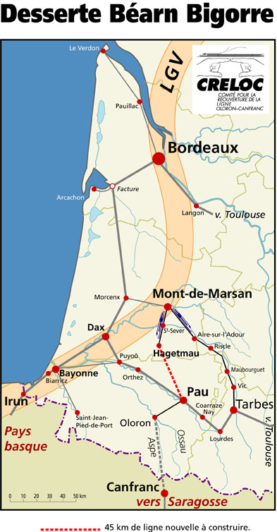 La proposition du CRÉLOC permet donc, au prix de la construction de seulement 45 km de ligne nouvelle classique et de la rénovation d’environ 130 km de lignes existantes de mettre Pau et Tarbes à 3 heures de Paris, sans pour autant pénaliser le tracé de la LGV de Bordeaux à l’Euskadi par un déport excessif de celle-ci au sud-est. L’augmentation du maillage ferroviaire qu’apporte cette solution accroît également les possibilités des trafics tant TER que fret. Elle accroît également la pertinence de la ligne Pau--Canfranc--Saragosse, donnant à l’Aragon une réelle ouverture ferroviaire vers le nord. Le transit TGV et TER-GV induit par ces deux lignes desservant le Béarn et la Bigorre via Mont-de-Marsan garantirait à cette ville une desserte directe de qualité.