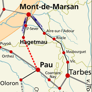 1. Liaison ferroviaire avec Pau assurée par une ligne classique nouvelle, électrifiée et prolongeant l’actuelle ligne Mont-de-Marsan--Saint-Sever--Hagetmau jusqu’à Pau. Cette ligne apte à la circulation à 220 km/h entre Pau et Hagetmau se raccorderait à la ligne Dax--Pau, légèrement à l’ouest de Lescar pour éviter au mieux les zones nouvellement urbanisées au nord-ouest de Pau. Malgré la modestie de la vitesse possible sur la section sinueuse longue de 15 km, Saint-Sever--Hagetmau, une vitesse moyenne sur le trajet de l’ordre de 160 km/h serait accessible et permettrait de parcourir en moins de 30 minutes les 80 km du trajet Mont-de-Marsan--Pau. Cette ligne pourrait dans un premier temps demeurer en voie unique sur sa plus grande partie, les réserves foncières nécessaires à une mise à double voie ultérieure étant néanmoins effectuées d’emblée. Des sections à double voie de quelques kilomètres seulement pourraient permettre les évitements sans ralentissement majeur. L’arrivée légèrement à l’ouest de Pau permettrait un raccordement ultérieur efficace à une future ligne directe vers l’Espagne à travers le massif pyrénéen.
