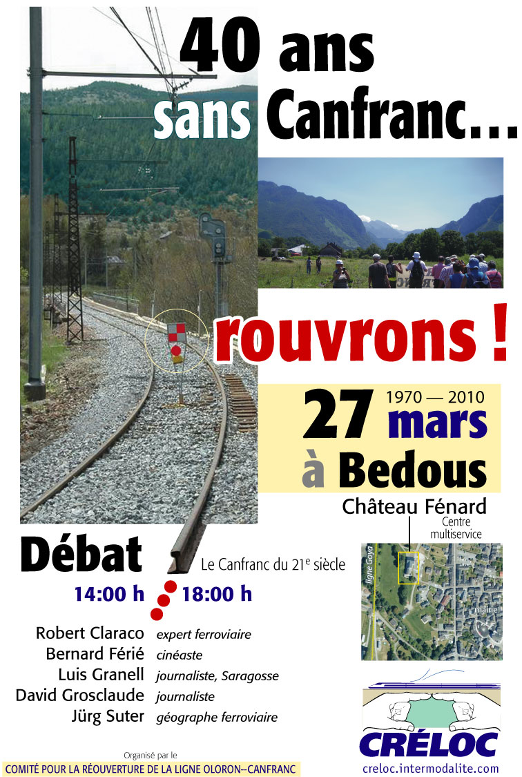 L’après-midi À 14 heures, le château Fénard, centre multiservice de Bedous, ouvrait ses portes à une soixantaine de personnes venues écouter les intervenants que le CRÉLOC avait appelé pour animer le débat : • Luis Granell, journaliste espagnol, il précisa l’état de la ligne du côté espagnol, entre Zaragoza et Canfranc, en rappelant que l’Espagne souhaiterait que la France donne des signes concrets engageant la réouverture de manière irréversible. • David Grosclaude, journaliste et nouveau conseiller régional, rapporta les bénéfices du Canfranc en matière de protection de l’environnement et de ses capacités à réguler le flux de marchandises dont le transport par route ne s’impose pas nécessairement. • Jürg Suter, cheminot et géographe suisse, démontra la capacité technique du Canfranc à absorber chaque jour 30 à 40 trains de voyageurs et autant de fret, tant en traction électrique que thermique. • Robert Claraco, expert ferroviaire, annonça la création du premier opérateur ferroviaire de proximité, entité appelée à se développer pour assurer la capillarité du réseau ferroviaire partout où les « grands » exploitants rechignent à aller. Cet exemple trouverait toute sa pertinence dans l’exploitation du Canfranc. Outre ces quatre animateurs très applaudis, le débat a également accueilli Bernard Uthurry, maire d’Oloron-Sainte-Marie et 1er vice-président du Conseil régional d’Aquitaine, en charge des infrastructures. Son assise locale et ses nouvelles fonctions sauront-elles être le levier politique tant attendu pour sortir le Canfranc de l’ornière ?