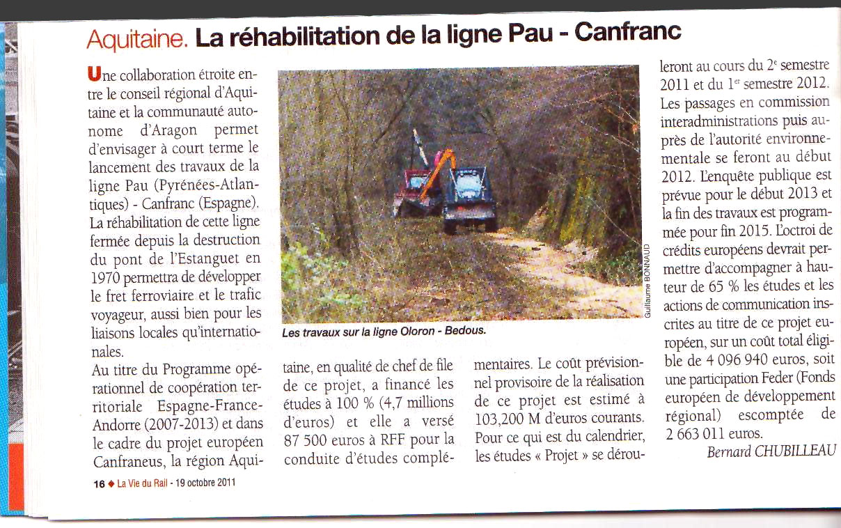 Le vendredi 30 avril, a été signé à Pau un mémorandum franco-espagnol autour de la voie ferrée Pau - Saragosse. Ratifié par le secrétaire d’Etat espagnol aux Infrastructures (Victor Morlan), son équivalent en Aragon, le président de la région Aquitaine (Alain Rousset) et le préfet des Pyrénées-Atlantiques au nom de l’Etat français, il prévoit des « études complémentaires au projet de réouverture de la ligne ferroviaire Pau - Canfranc », fermée depuis plus de 30 ans. 850 000 euros (dont 45 % abondés par l’Union européenne) seront consacrés à cette étude à boucler en 24 mois. Cette décision applique les orientations des sommets franco-espagnols de 2006 (Gérone) et janvier 2008 (Paris). Hypothèse de travail pour les experts : que faut-il prévoir pour que la ligne puisse accueillir 1,5 million de tonnes de fret par an ? A l’occasion, s’est constitué un « réseau des villes pour la réouverture du Pau - Canfranc » rassemblant Orthez, Lourdes, Lacq, Pau et Oloron côté français, Saragosse, Huesca, Jaca et Canfranc côté espagnol.