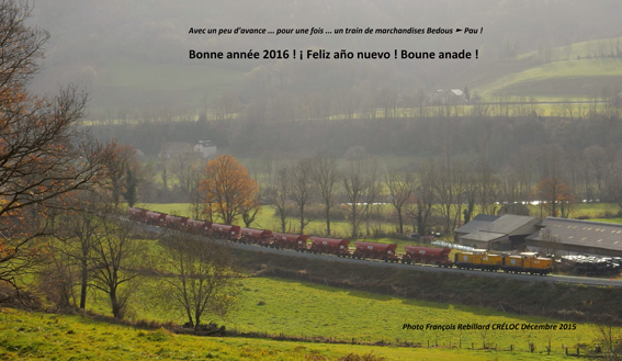 Mais ne perdons pas de vue le rétablissement des circulations ferroviaires entre Pau et Oloron, interrompues "jusqu'à nouvel avis" depuis 10 semaines. Préparons aussi le fret de bois, paille, maïs et autres marchandises vers et depuis Bedous. Pouvoirs publics et Entreprises, au travail pour faire revenir les trains à Bedous et enlever des camions de la RN 134 début 2016 !!!