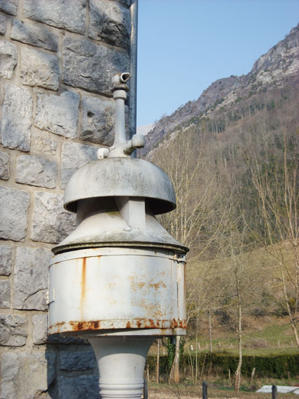 cloche électrique f. — la cloche électrique d’annonce, ici (à Sarrance) de type « pigeonnier », permettait, par un jeu de déclenchement, d’annoncer l’arrivée d’un train ; le timbre de la sonnerie était différente selon la direction d’où venait le train. Ce type de cloche comporte un relais de batteries en cas de coupure de courant.<<