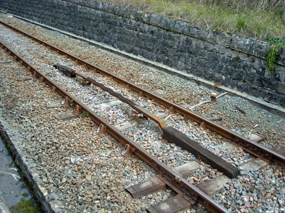 heurtoir m. — socle d’arrêt placé en bout de voie entre les deux rails pour sécuriser la fin de la dite voie; le mot butoir est une autre appellation parfois utilisée.<<