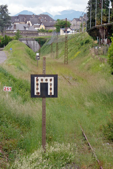 Pi picto en potence ou U inversé — annonce d’un tunnel ou d’un ouvrage d’art à gabarit réduit (au PK 251 à 500 m de la gare d’Oloron, ou sur ce dessin).<<