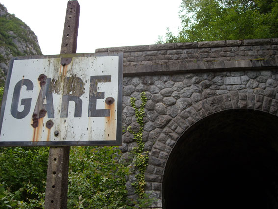 gare (signal) m. — À l’approche d’une gare le panneau carré porte le mot en toutes lettres. Ici avant le tunnel du Portalet débouchant sur la gare d’Urdos.<<