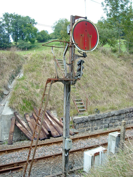disque D ou d’arrêt différé m. — le disque rouge commande au mécanicien de passer en marche à vue aussitôt que possible, et de marquer l’arrêt au premier signal ou aiguillage rencontré (Oloron, à 1500 m du BV). Le disque de protection (ouvert) de la gare de Buzy-en-Béarn, en venant de Pau, celui-ci est opérationnel, contrairement au précédent qui devra être remplacé.<<