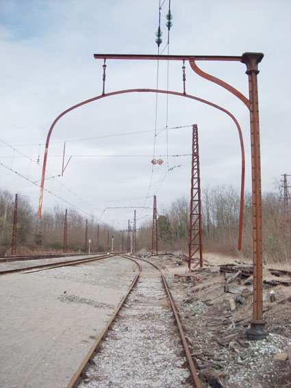 console f. — dispositif de suspension de la caténaire sur les poteaux.<<