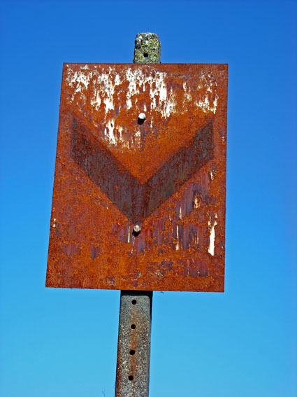 V picto — signal ferroviaire pour indiquer la proximité d’une aiguille prise en pointe (cf. Lurbe).<<