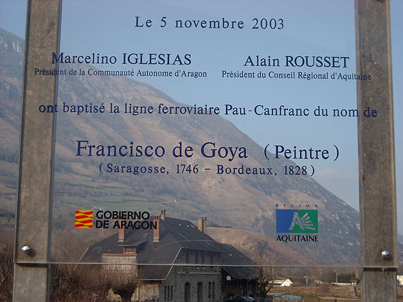 Goya (Francisco José de Goya y Lucientes), né à Fuendetodos, près de Saragosse, le 30 mars 1746 et mort à Bordeaux 16 avril 1828, est un peintre et graveur espagnol. Il est connu pour son esprit progressiste, ses images très dures contre la guerre et l’oppression (autoportrait, 1771-1775). Son nom a été donné à la ligne Pau--Saragosse, villes qui se sont jumelées en 1970.<<