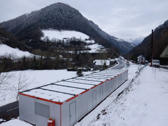 La neige a déposé son blanc manteau sur le chantier de la voie ferrée entre Oloron et Bedous, perturbant un peu l'activité.