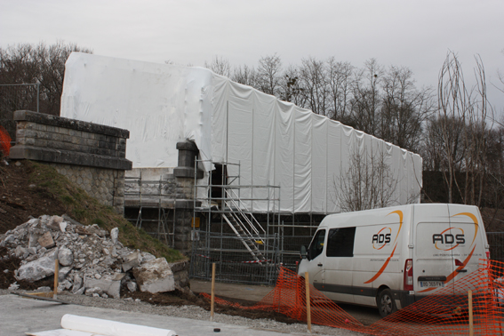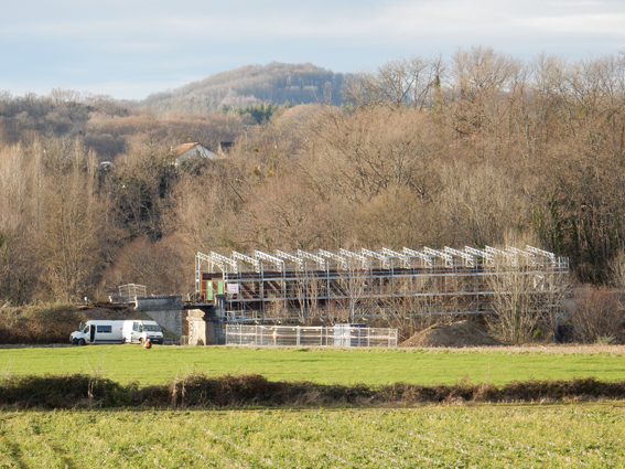 Le pont d’Arros est entièrement sous échafaudage ; l’entreprise ADS loge à Eysus