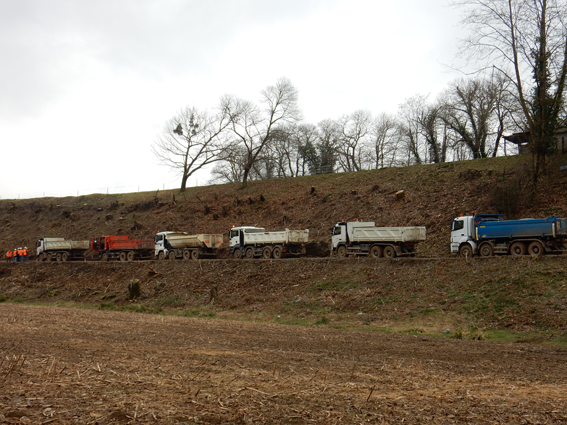 Une véritable noria de tracteurs agricoles est nécessaire pour évacuer la terre, au PN 55 de Pont-Suzon