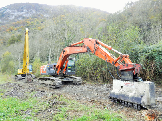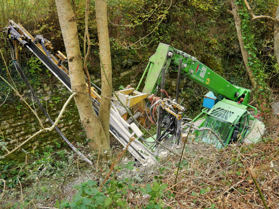 Dans la tranchée de Lurbe, une perforatrice en action pour le cloutage de la paroi rocheuse