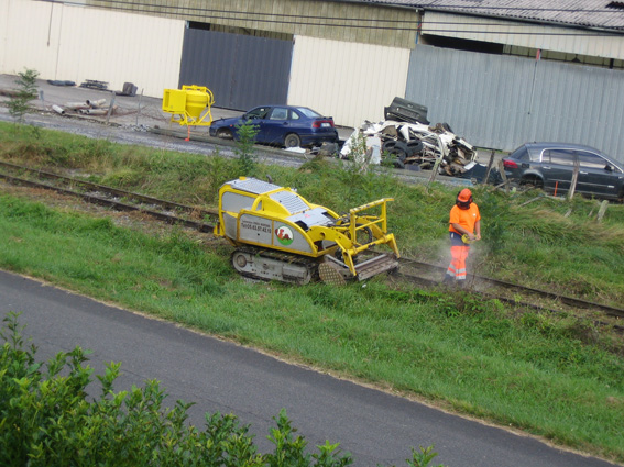 Les opérations de débroussaillage se poursuivent tout au long de la ligne. Elles précèdent la dépose de l'ancienne voie.