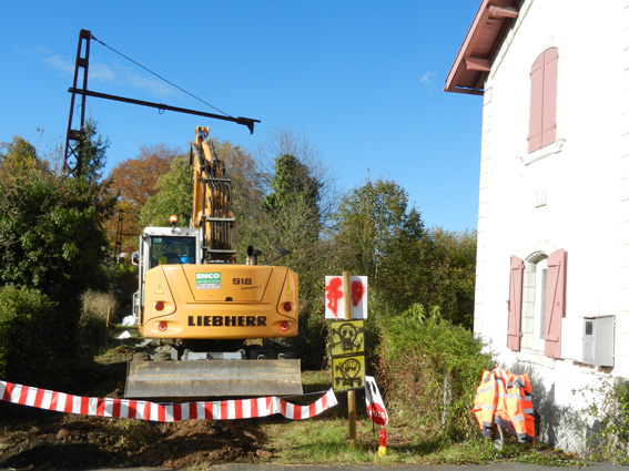 La dépose des voies est maintenant quasiment achevée. Les travaux de défrichement les plus importants, pour la suppression des passages à niveau (d'Escot et de Pont-Suzon), commencent.