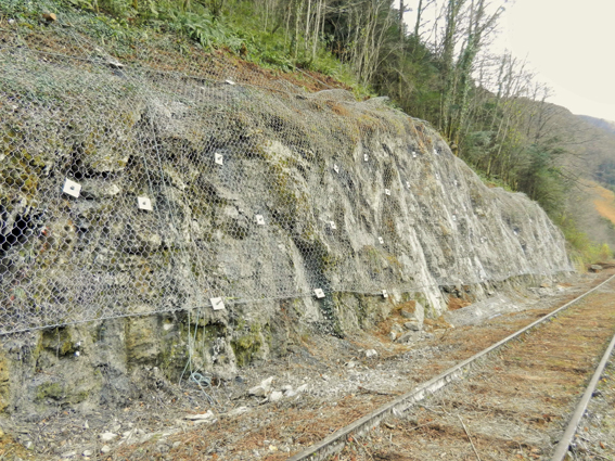 Entre Escot et Sarrance, au droit des Viviers de France, grillage de protection de la paroi rocheuse