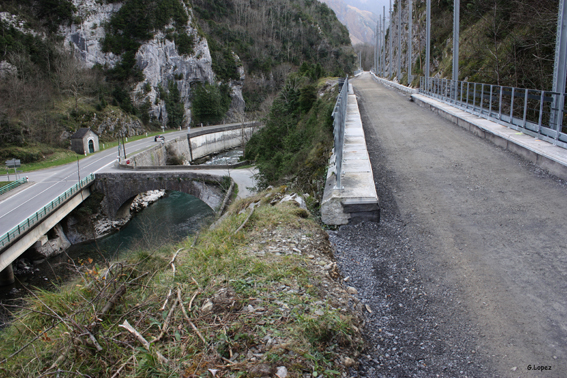 Ici, la pose de voie est très exactement à mi-chemin entre Oloron et Bedous, au pont-route des Estouerits,