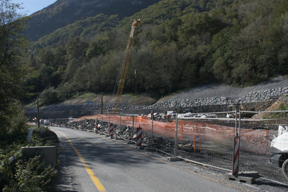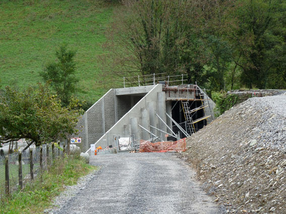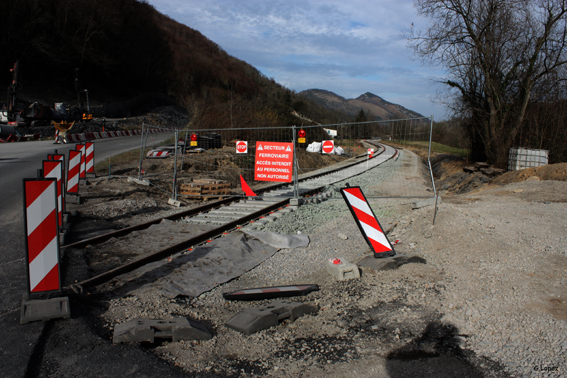 Si la pose des rails n'a pas trop avancée depuis 15 jours – seulement 105 mètres de plus posés vers Bedous. (PK259825), en revanche les travaux annexes, près de Lurbe, se poursuivent (pose de grillage, enrochements, etc...)