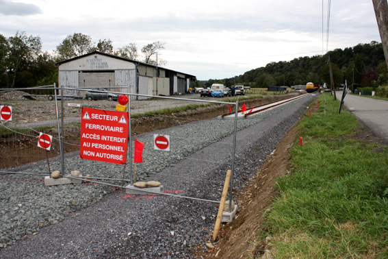 Pour l'instant, la pose de la voie est arrêtée au niveau du passage à niveau après la gare de Lurbe