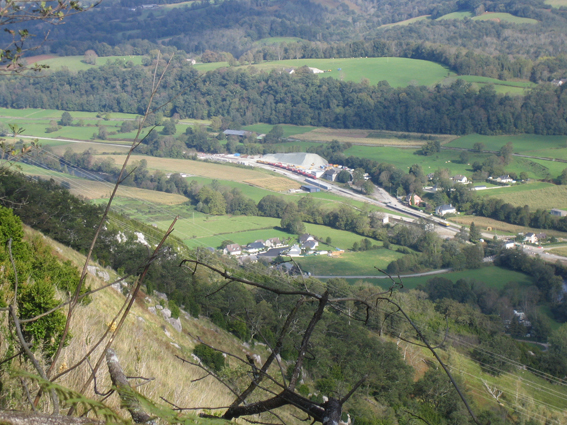 Vue générale de la gare de Bedous prise depuis le pont-route, côté Canfranc. On distingue bien les terrassements