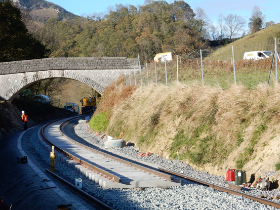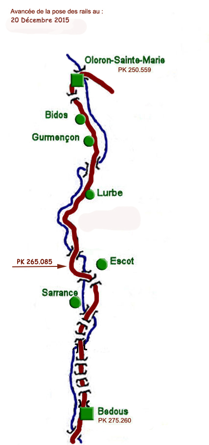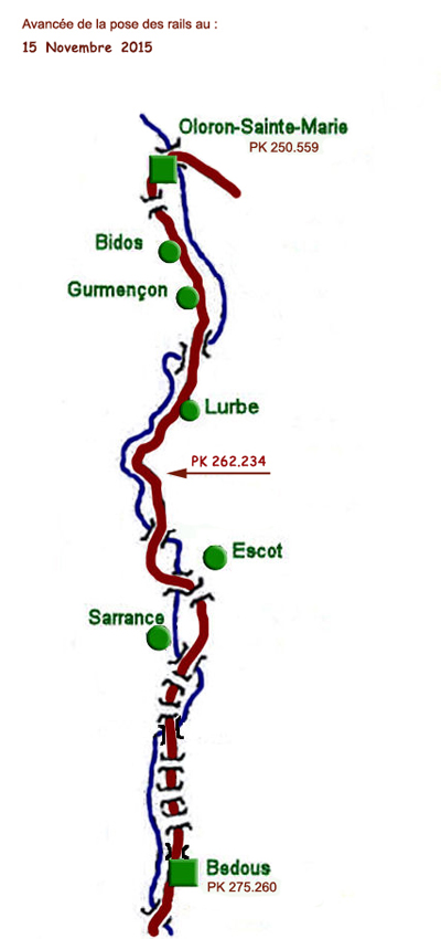En cette mi-novembre 2015 (le 18), la pose de voie est très exactement à mi-chemin entre Oloron et Bedous - symboliquement à mi-chemin aussi entre Pau et Canfranc - au pont-route des Estoueris, au sud de la commune de Lurbe ( PK 262 + 576). Il est donc temps de se préoccuper de la réouverture complète et des conditions futures d'exploitation des trafics voyageurs et fret !