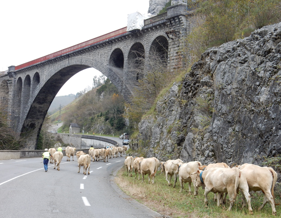 Sous le viaduc d'Escot, le troupeau de vaches et ses accompagnants ont découvert les travaux de peinture